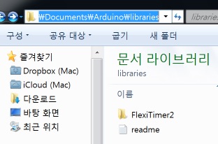 다운받은 라이브러리 압축을 해제한 후 디렉토리를 '내 문서 -> Arduino -> libraries' 로 옮겨 준 다움 아두이노를 재시동하면 된다.